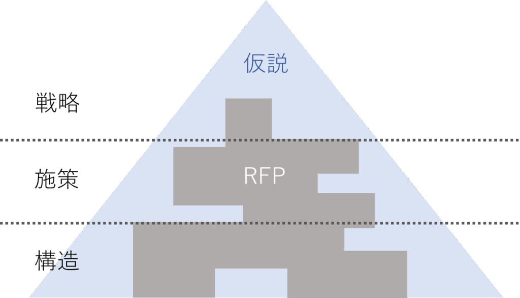 この時、仮説の整理は様々な手法が考えられますが、例えば戦略、施策、構造と分解して検討できます。