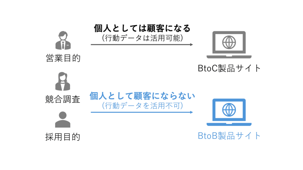 結果として、BtoCで一般的なWeb行動データの分析手法をそのまま導入しても「うまくいかない」という状態になります。