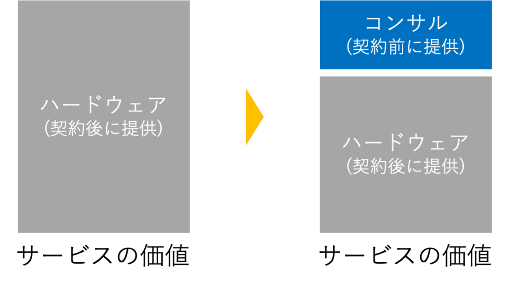仮にハードウェア製品であっても、導入効果を担保するコンサルティングを組み合わせてサービスとして提供することで、コンサルティング部分が契約前に提供できるサービスの一部となります。